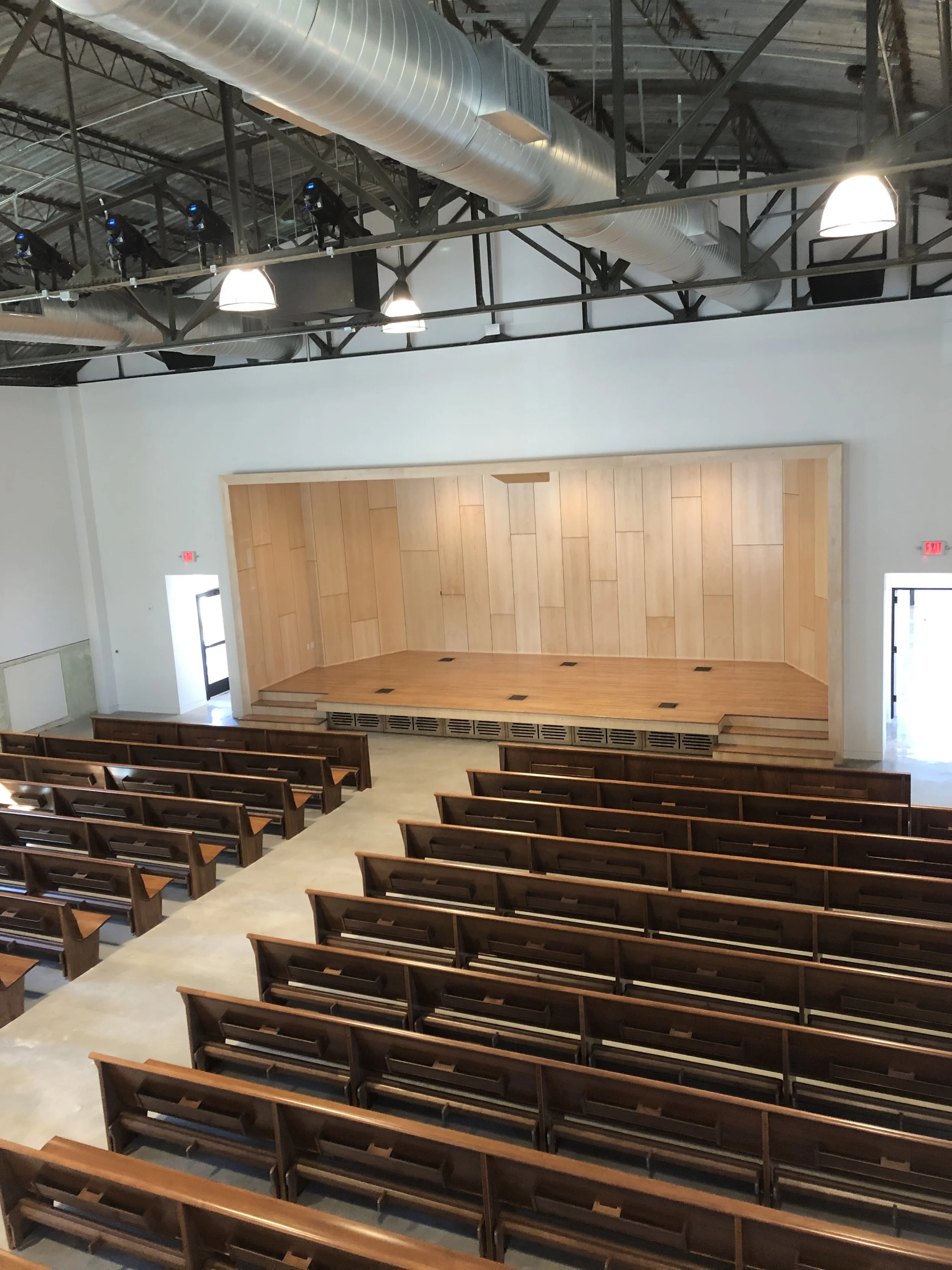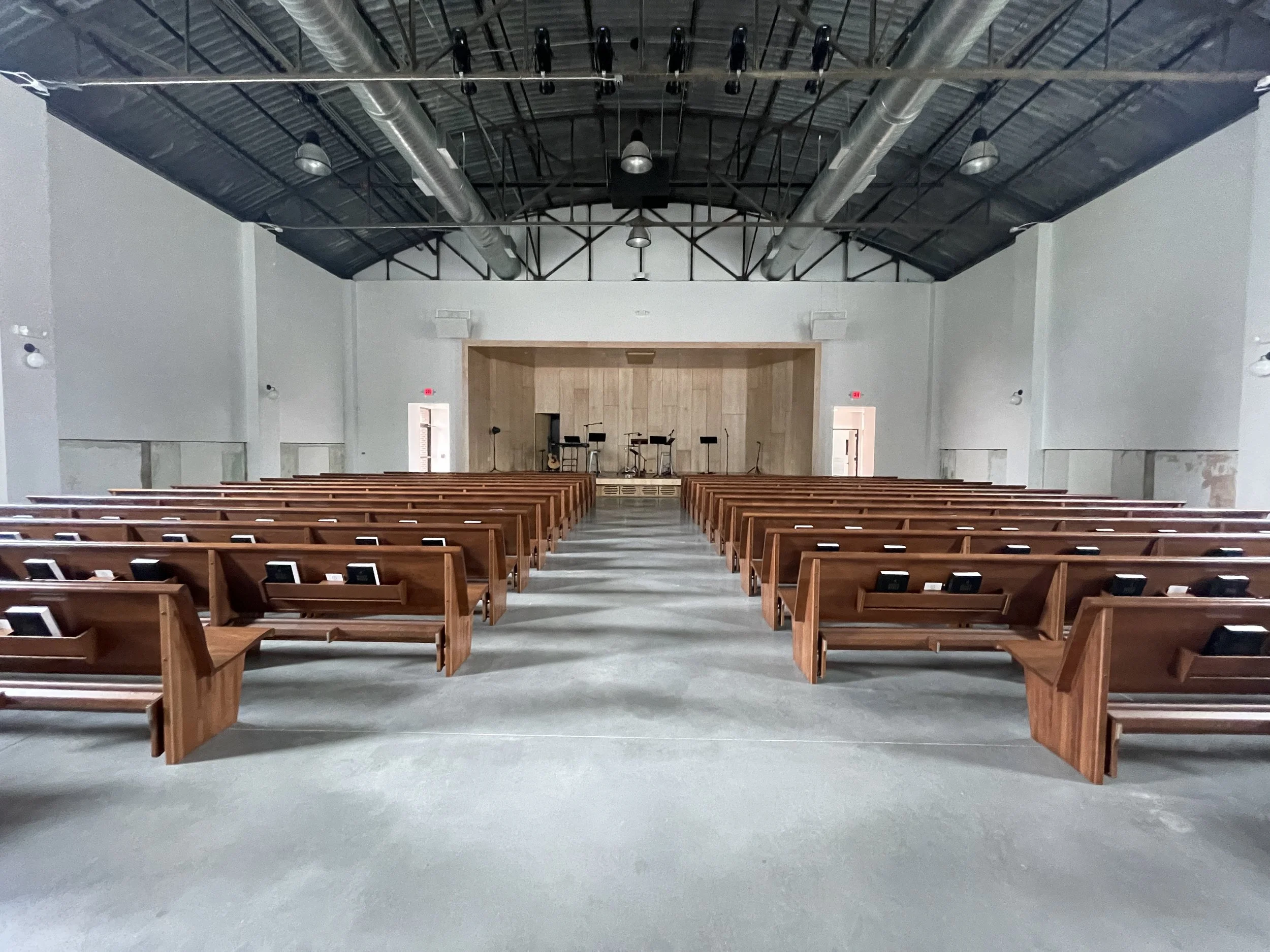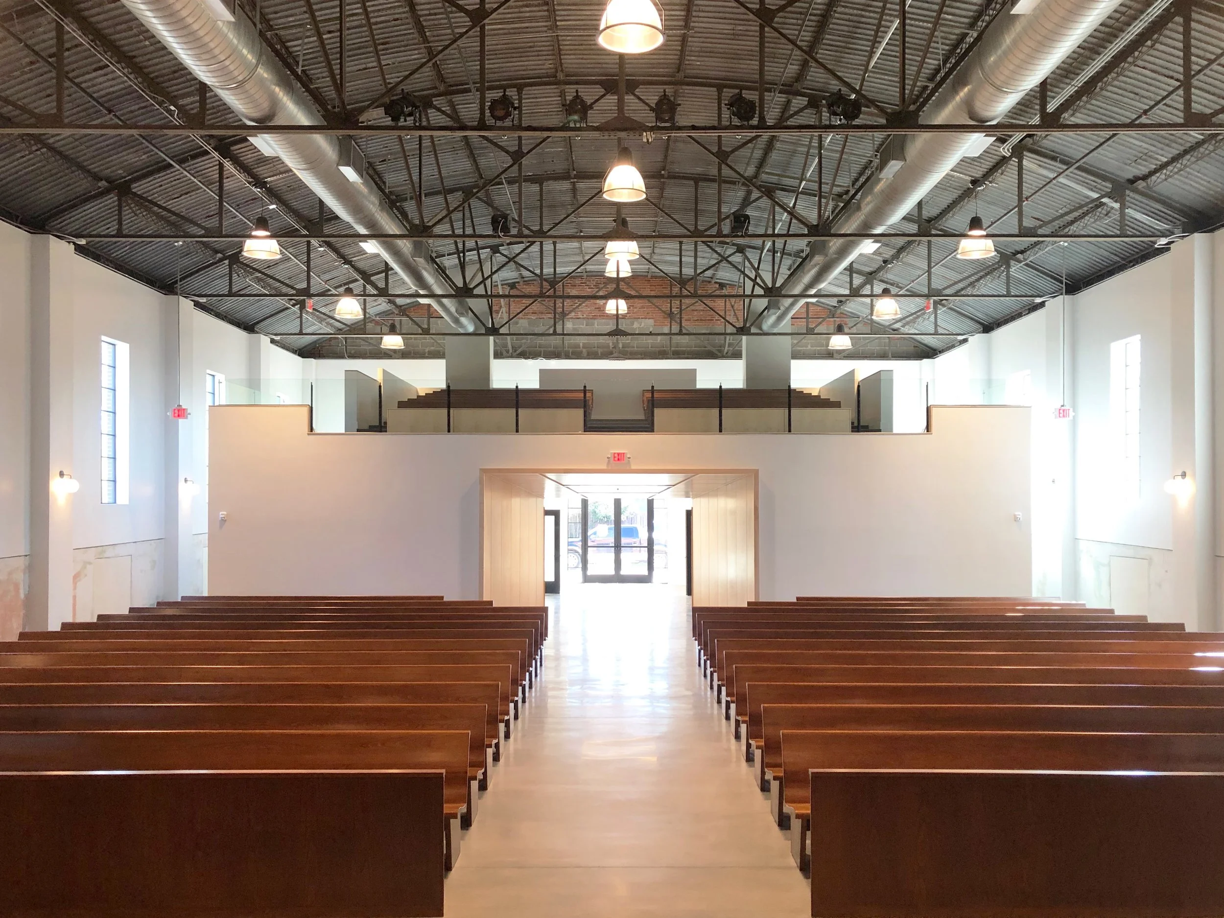 The existing building was previously North Main Baptist church. Built in 1940, it had been unoccupied since the early 1990’s. This two-story, load-bearing masonry structure is capped by a beautifully preserved bowstring truss roof structure over a double height worship space. Our design reinforced the masonry structure in this building and modernized the facility while retaining its character and housing a new sanctuary space with mezzanine seating. On the west side of this existing building, a new steel-frame, ground-up addition houses a fellowship hall and staff workspace.