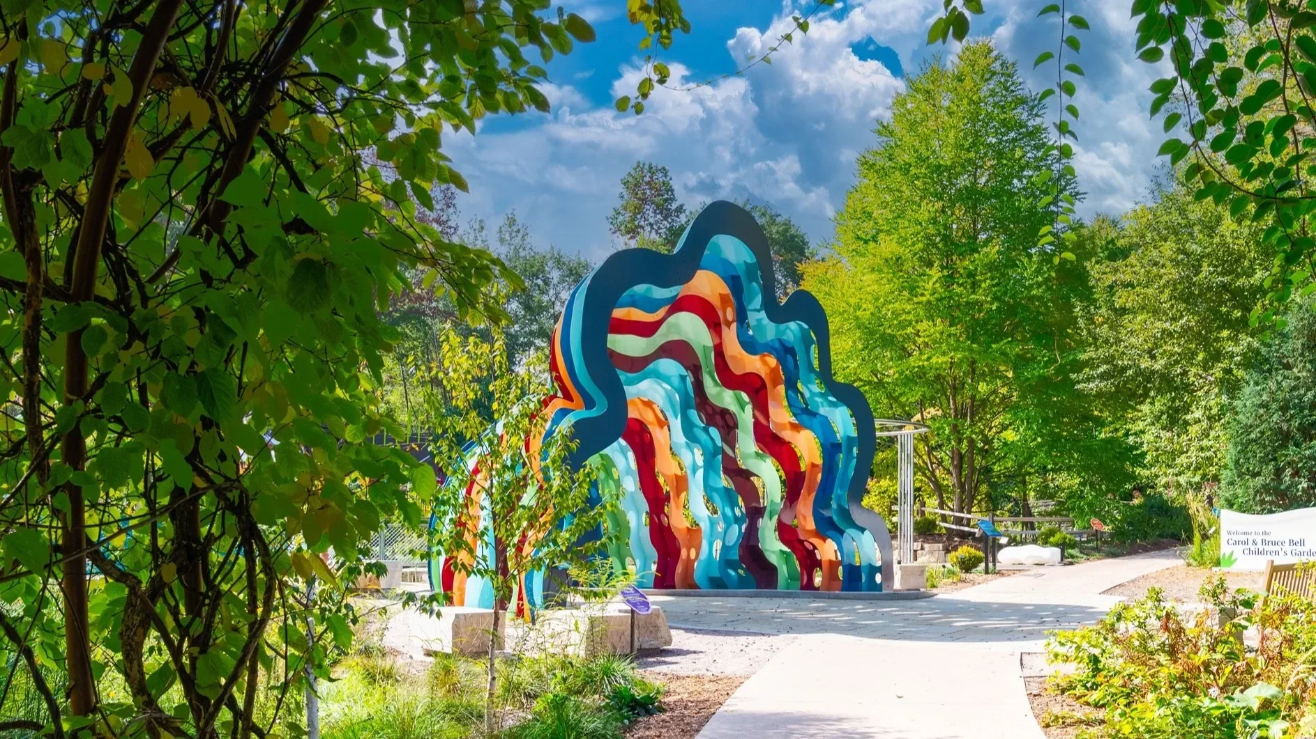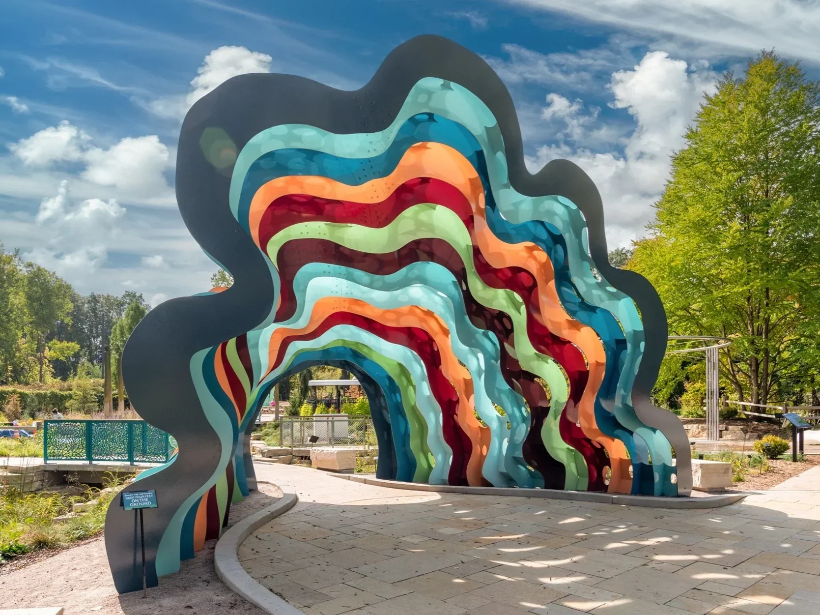 From the Artist: "Our proposal for a sculptural gateway for the Children’s Expansion at the Green Bay Botanical Garden focuses on the interconnectedness of nature, growth, and life cycles. We envision Chromatic Passage is as both a physical threshold into the garden as well as a metaphorical journey into the wonders of the botanical world. The sculpture features a concentric array of planar steel frames that are vertically erected in series. The planar frames are organically contoured to create a dynamic, spiraling gesture that invites viewers to pass through the iconic gateway sculpture. The dramatic concentric composition recalls various patterns, both visible and hidden, that are found in the natural world. These include tree growth rings hidden within trunks and branches, the phyllotaxis spirals of plants and invertebrate shells, a swirling seedpod in the wind, the ripples of water caused by a fallen leaf into a pond, the variegated colors of bracket fungi, and the layered mineral deposits found within agate rock formations. The composition of the sculpture is intentionally abstracted to evoke these motifs and a myriad of other natural forms and patterns. Similarly, the planar frames are multicolored to celebrate the chromatic diversity found across nature. The form and colors of Chromatic Passage come together to create a bold gateway poetically interweaving themes of discovery, biodiversity, and whimsy."