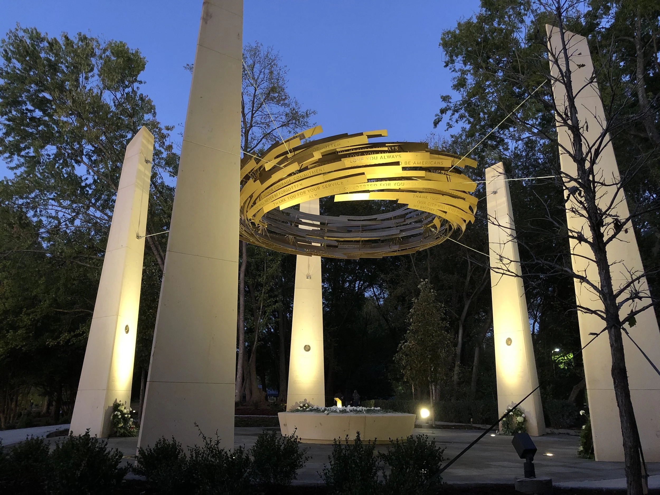The sculptural wreath is composed of interlacing, brass colored stainless steel arc bands waterjet cut with the powerful words of tribute from the community following the tragic and heroic acts on July 16, 2015. At the center of the plaza is a circular granite bench that provides seating and a contemplative place to look upwards through the wreath to the sky above. The words and circular form of the wreath become a powerful symbol of unity for Chattanooga. The relationship of the pillars and wreath become a metaphor for how Chattanooga will forever be connected to the Fallen Five and how the Fallen Five will always lift up the community and stand as beacons of hope, honor, valor, and sacrifice.
