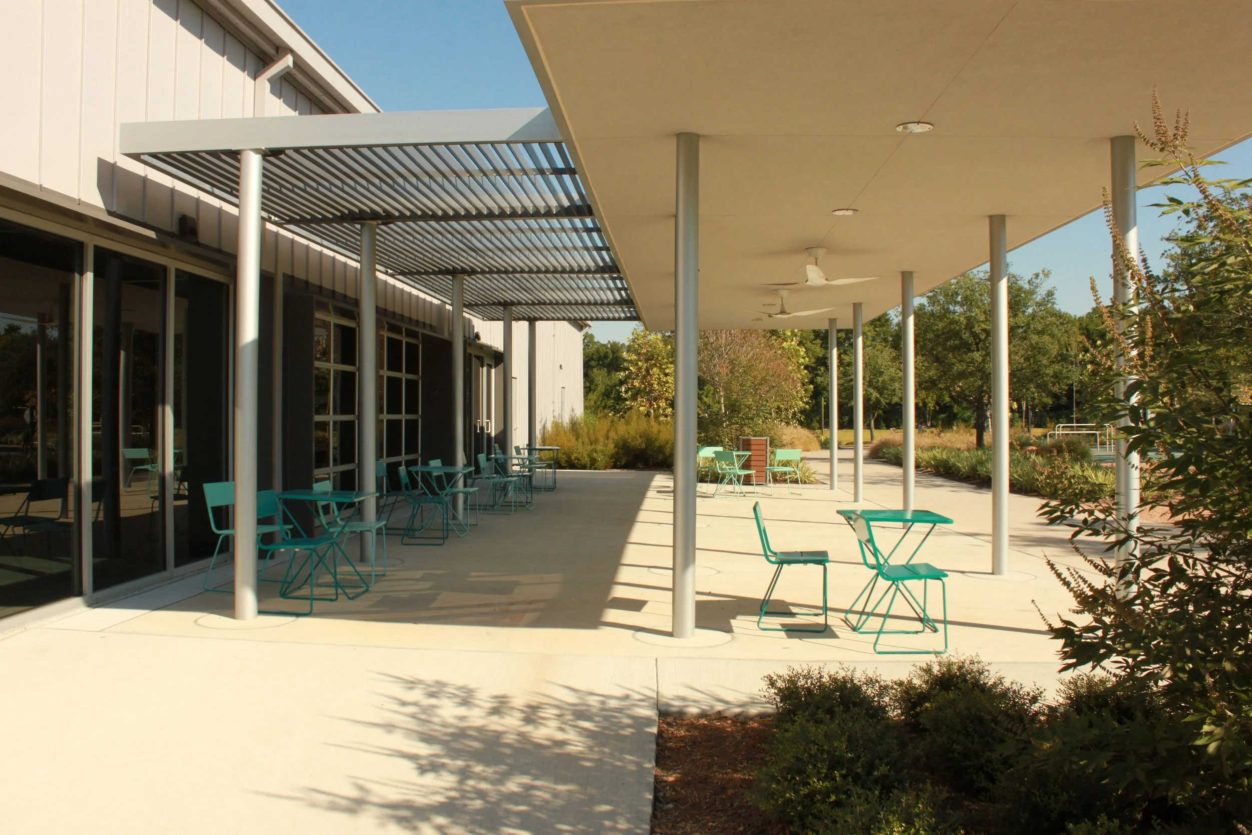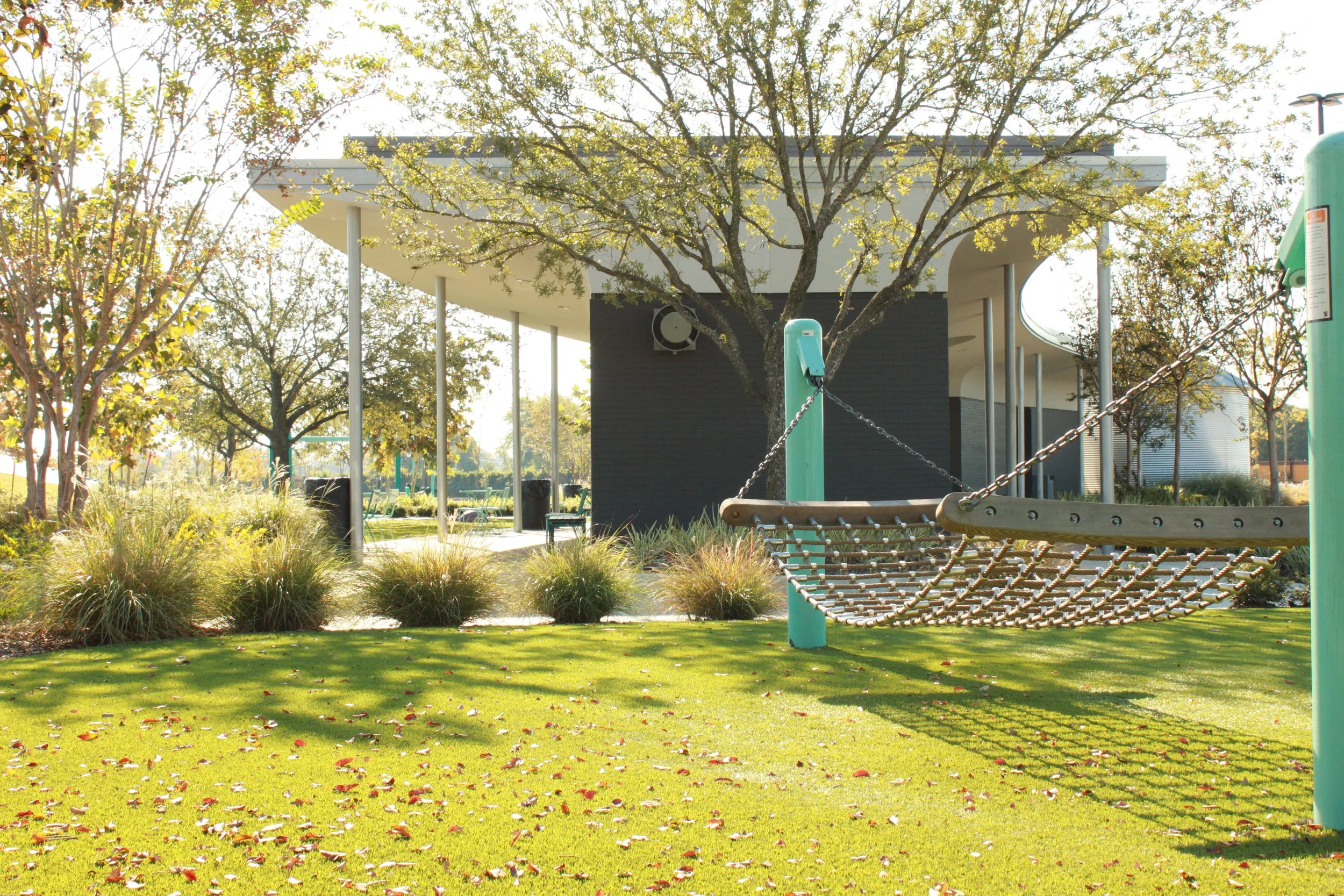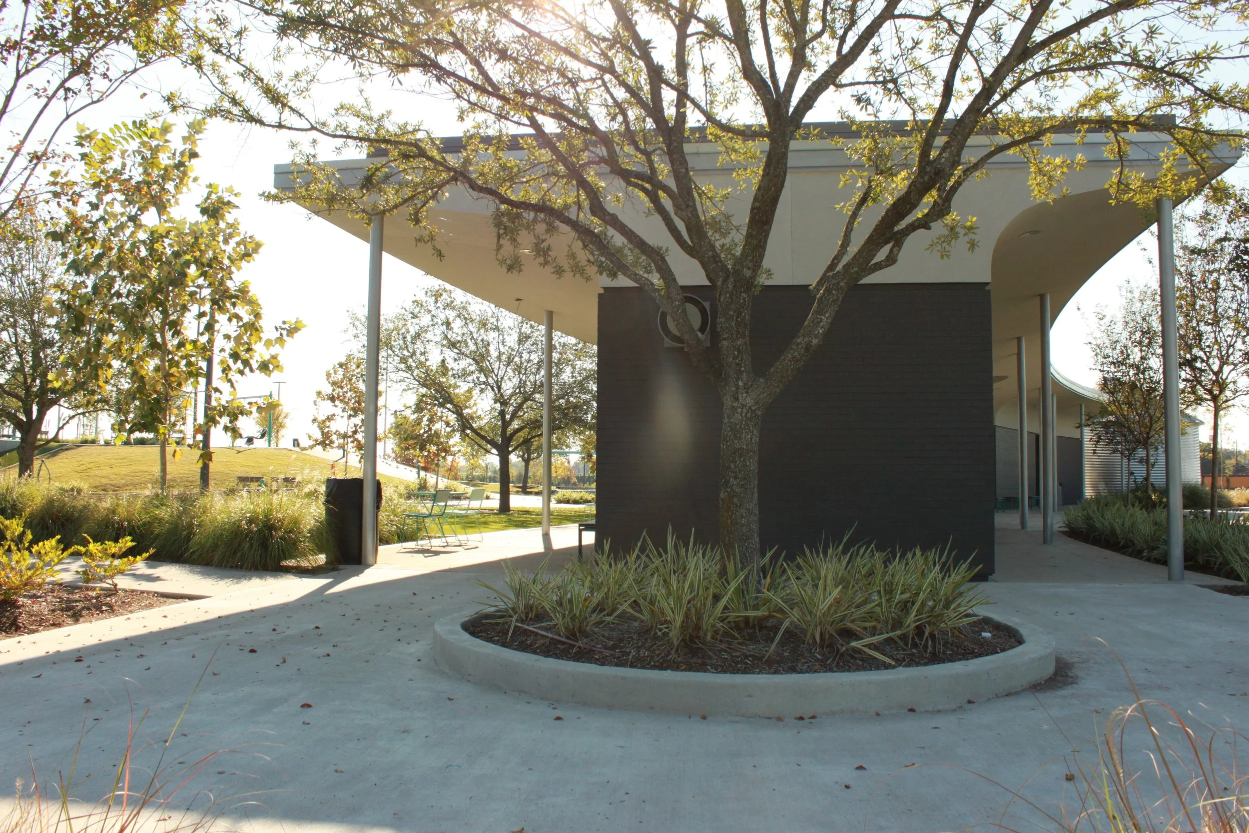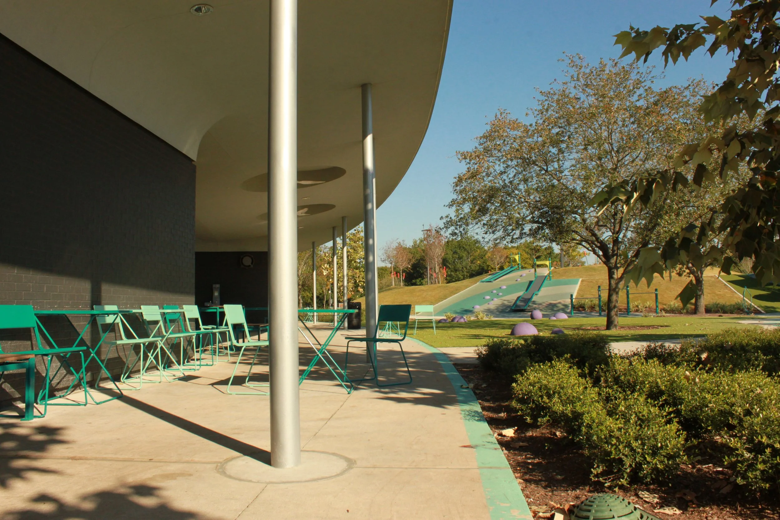 The gathering pavilion at James Driver Park takes the form of an abstracted dog trot, curved on a large radius with a sculpted plaster ceiling sweeping downward to meet brick clad restrooms. The facility is designed to exceed ADA accessibility for children and families of all abilities and needs. A secondary Pavilion fosters intergenerational dialogue between an active seniors center and the playground spaces across a large lawn.