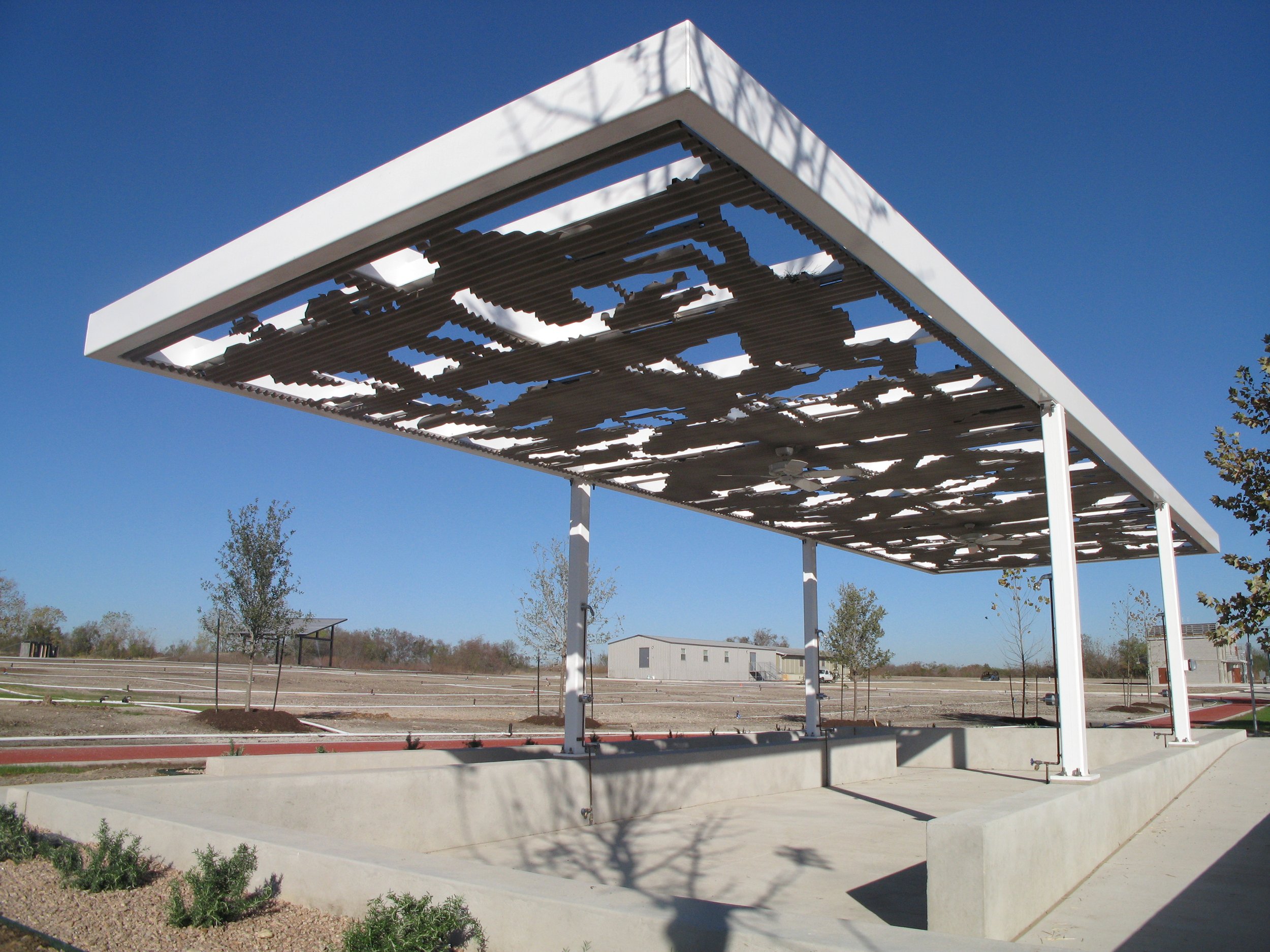 Designed by New York based installation artist Chris Doyle, is a Percent for Art project located at the City of Austin at the new Public Safety Training Facility. This permanent installation was designed as a modest, open-air shelter and includes a roof mural that was made through CNC cut perforations to the corrugated stainless steel canopy. The pavilion and canopy were fabricated and pre-assembled in Houston and shipped to Austin as a kit-of-parts that require minimal site work.
