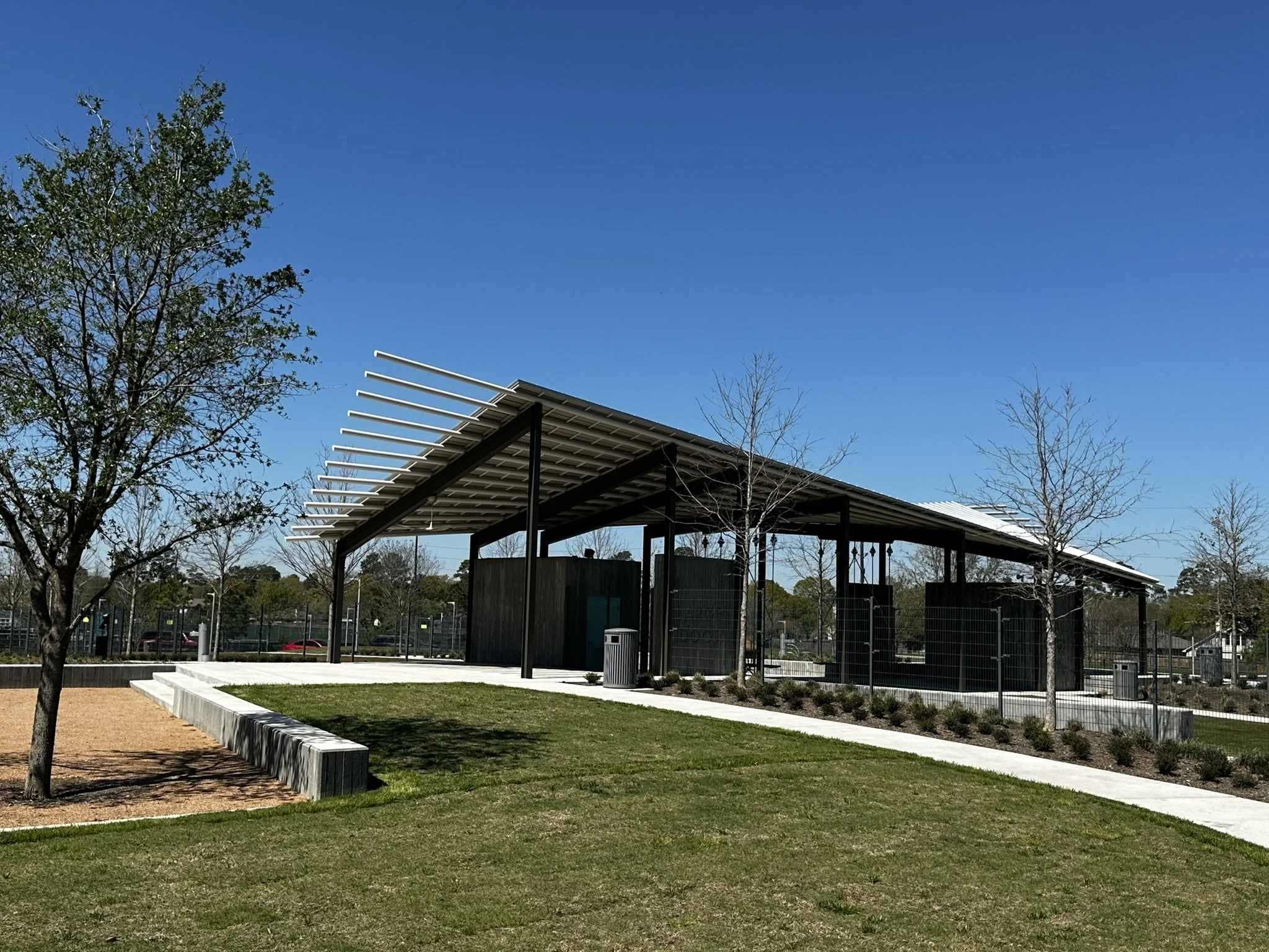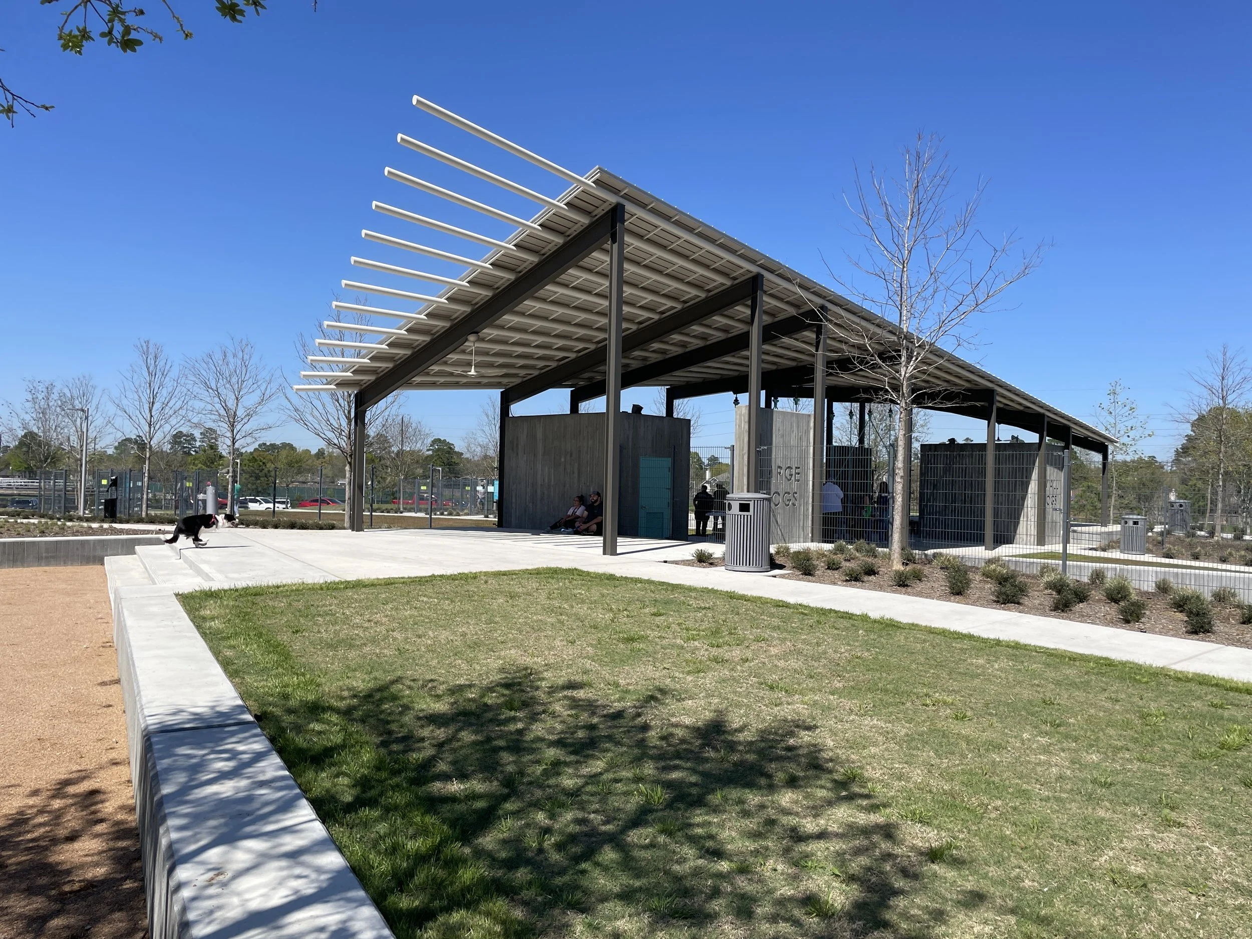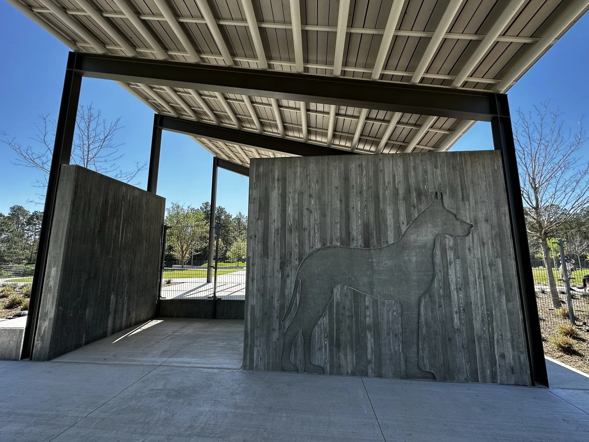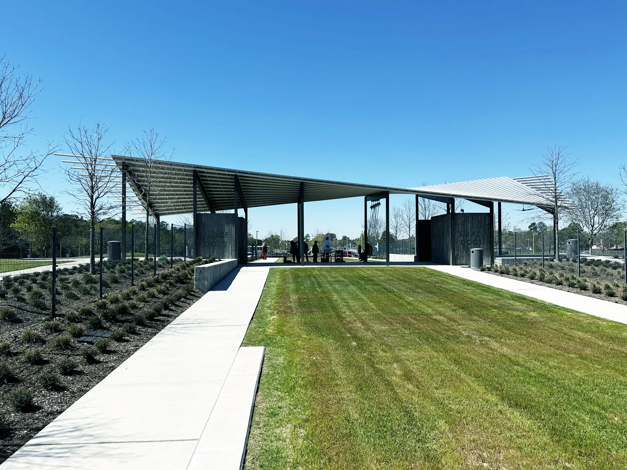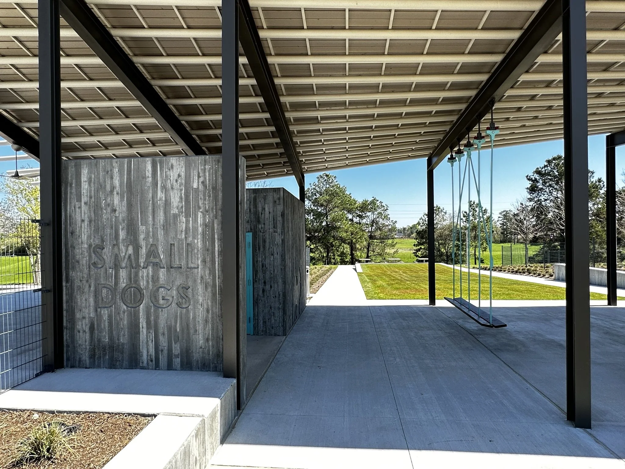This pavilion for a dog park located in the Trail of the Lakes Municipal Utility District in Atascocita, TX is the result of a collaboration between Metalab and landscape architects Four and One. Part of Four and One's master plan for this land included two parks for large and small dogs. Metalab's intent was to design a pavilion that stretched across both parks, creating interactive moments between people and dogs large and small under one sweeping structure. The pavilion's roof is built as a sequence of linear elements, producing a ruled surface reaching out from the middle of the park's central walkway and into the large and small dog zones at either end. The dramatic formal gesture of the roof is in reference to the dynamic character of dogs at play, be it a wagging tail or a thrown stick. Board form concrete storage rooms act as shear walls and integrated signage for visitors. The pavilion's landings are strategically raised so people walking outside the parks are almost at eye level with the dogs, bringing humans and dogs closer together.