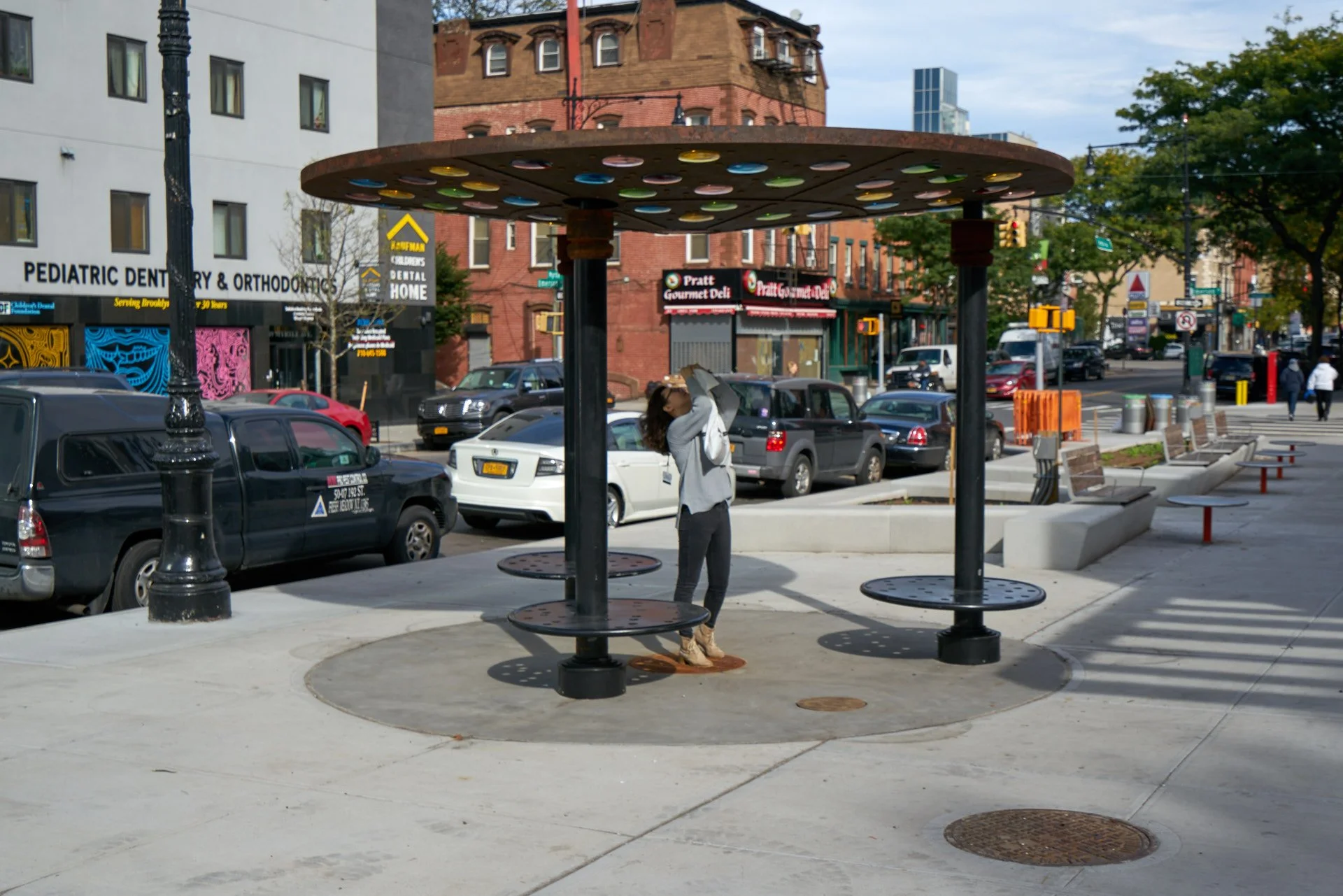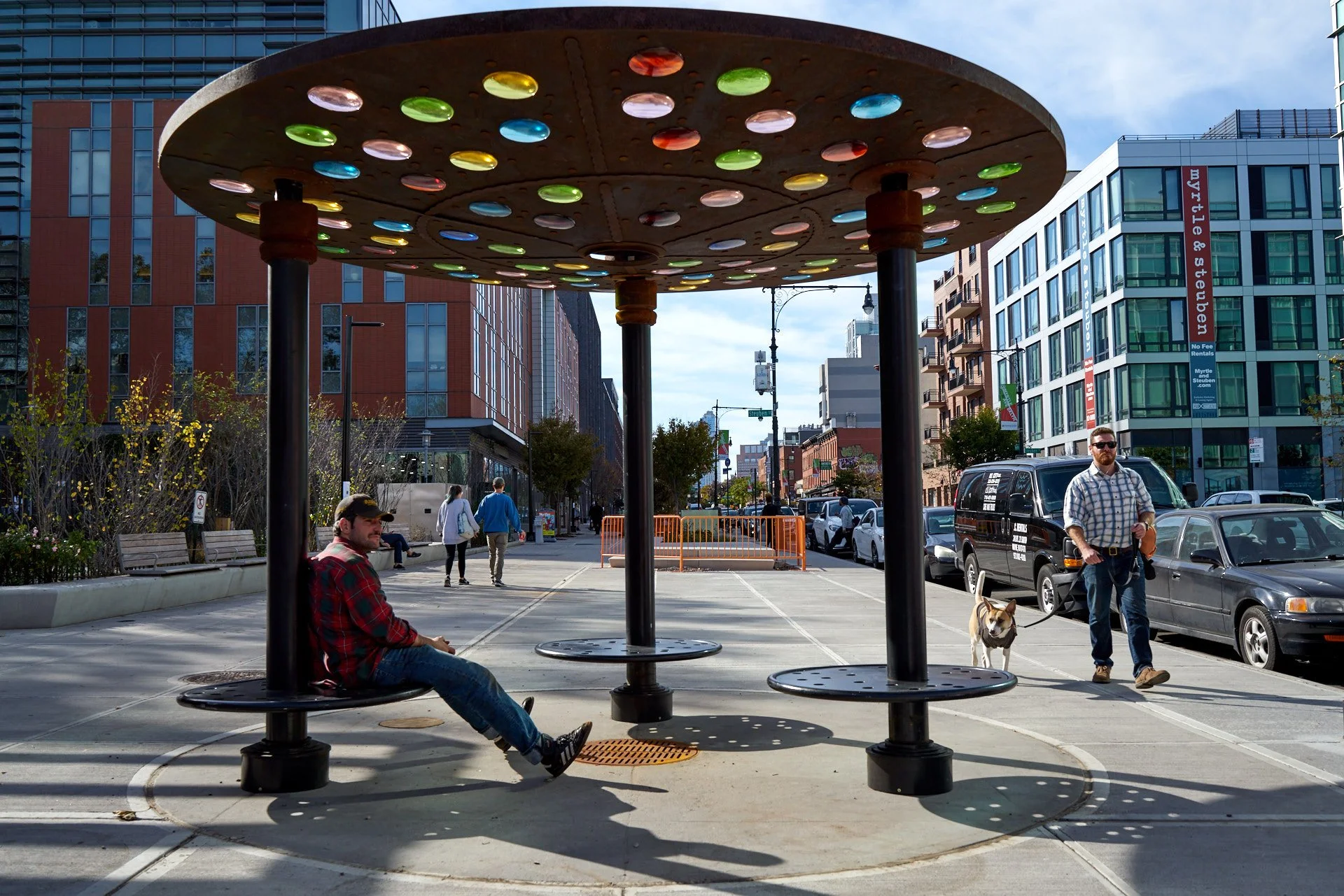 With the help of Metalab's architecture and project management services, artist Matthew Geller was able to realize "I ought to," which is sited on a public sidewalk in New York, NY. The installation is comprised of three circular stools arranged underneath a canopy of corten steel and colored glass. This concave canopy has a 24 inch oculus that allows water to drain on rainy days, becoming a passive water feature. Between the discs of colored glass, small steel medallions and linear braids decorate the canopy. This makes clear the installation's resemblance to a manhole cover, though in this case a manhole cover that has been enlarged to create a space for respite, providing shade from the sun or shelter from the rain.