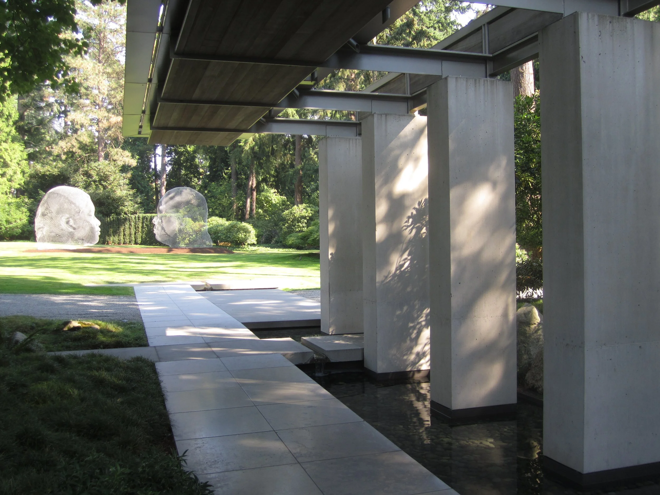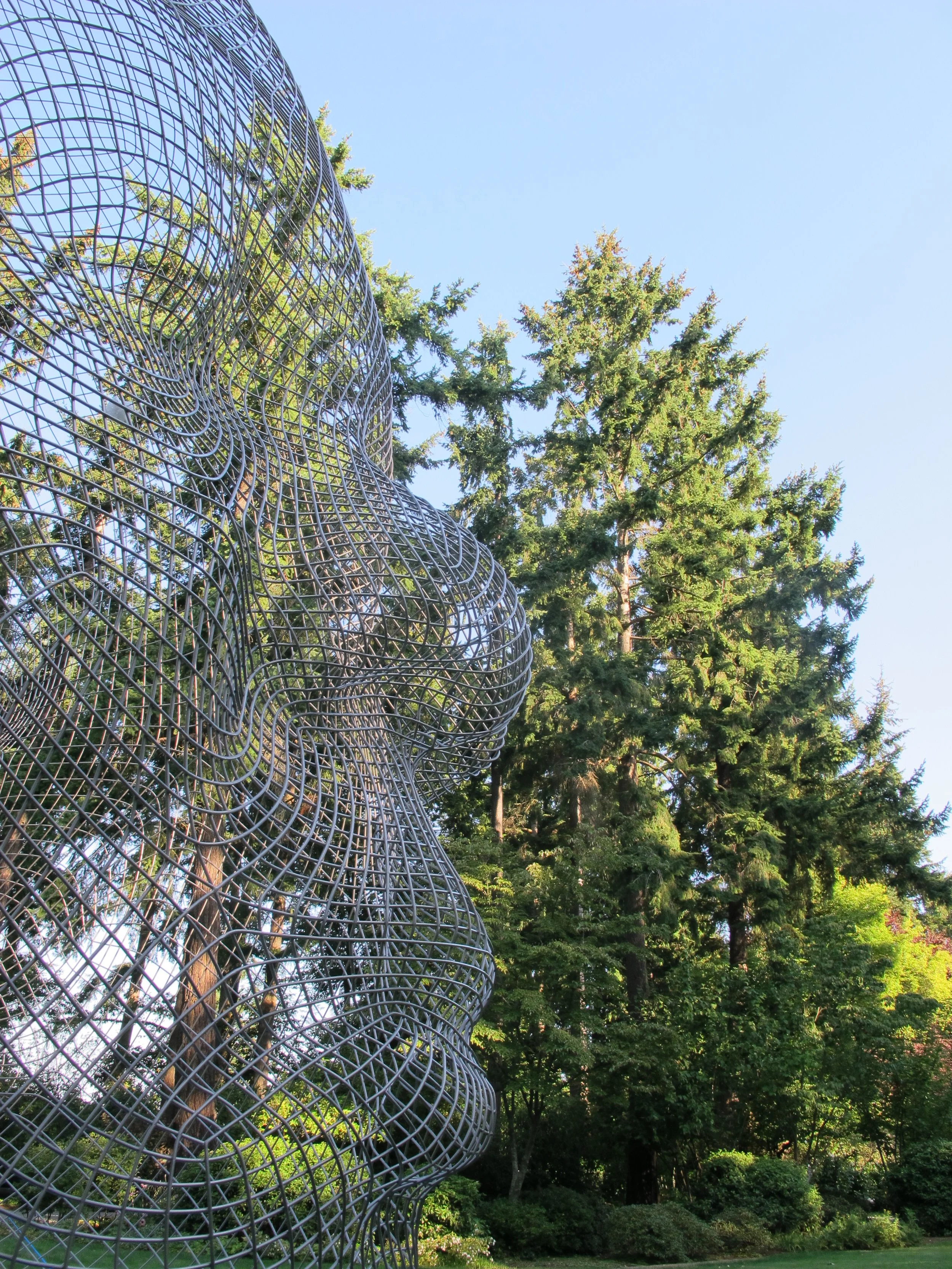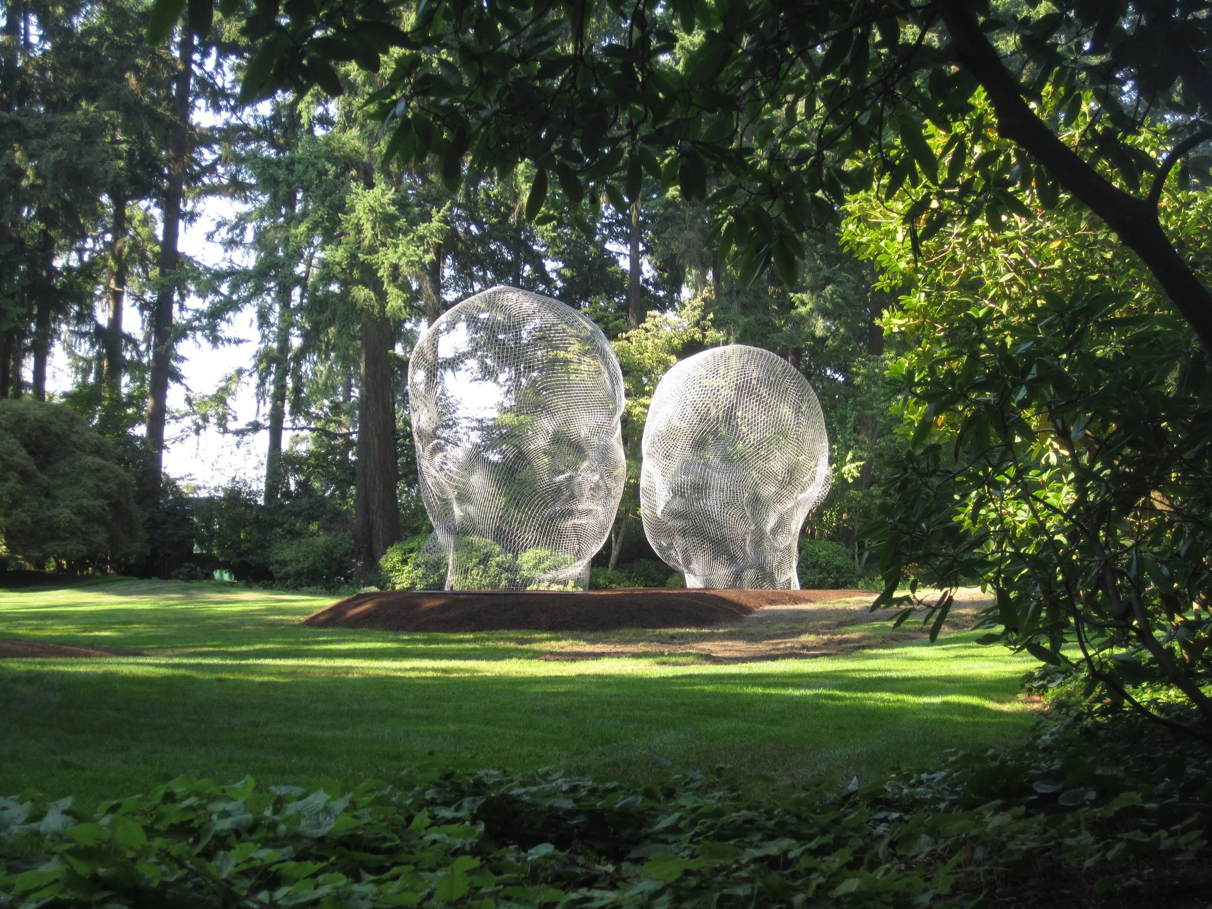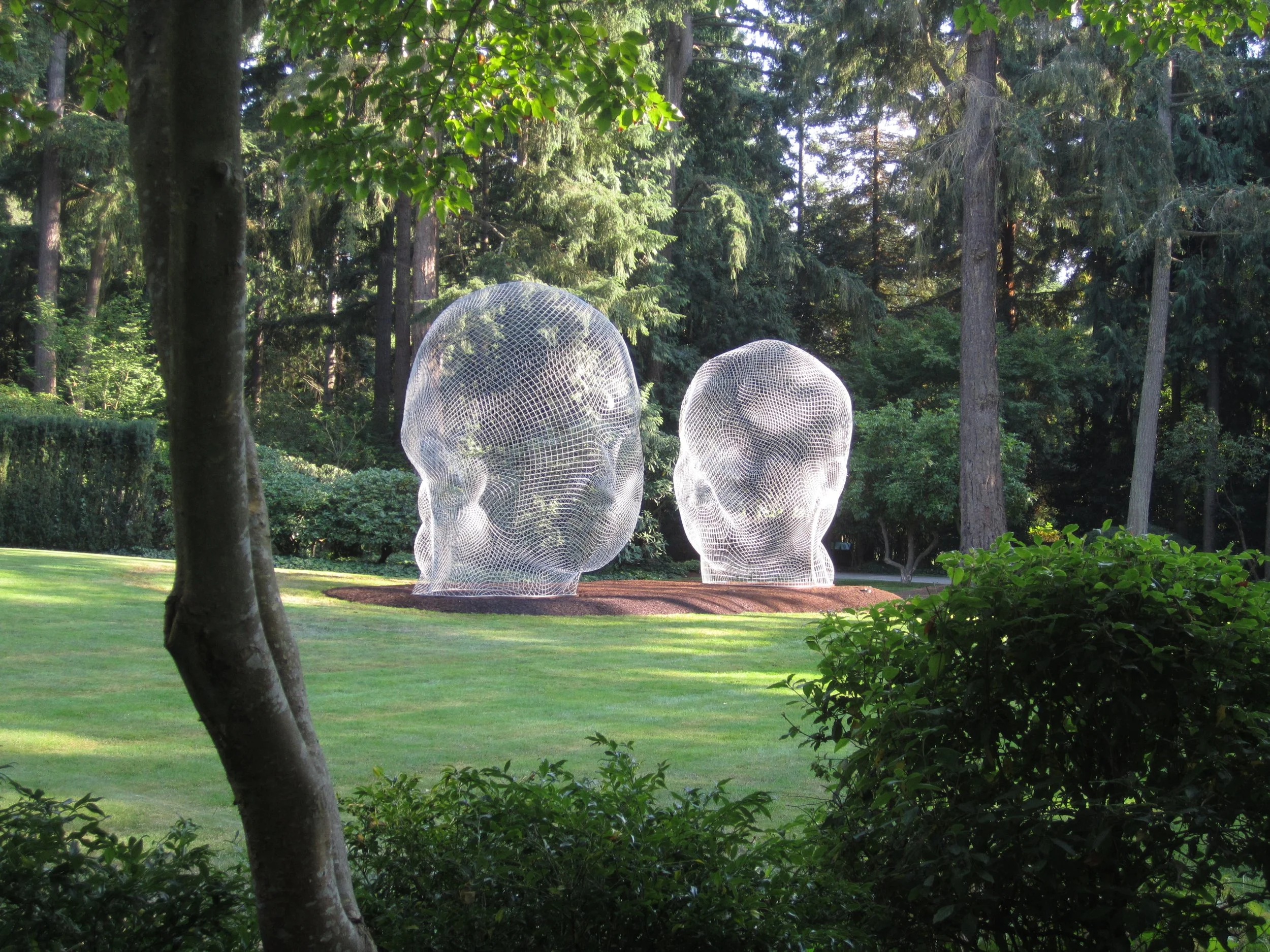 Jaume Plensa’s “IRMA AND NURIA” is a permananent addition to a private collection in Seattle, Washington, consisiting of two stainless steel wire mesh figures facing each other when viewed in profile.