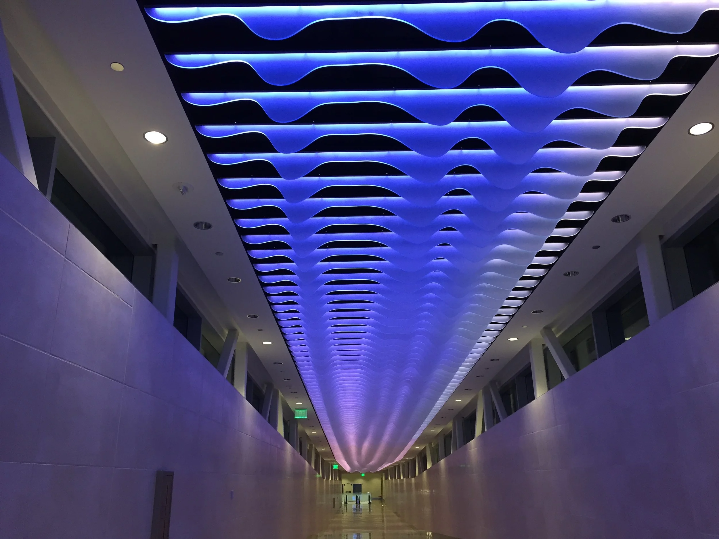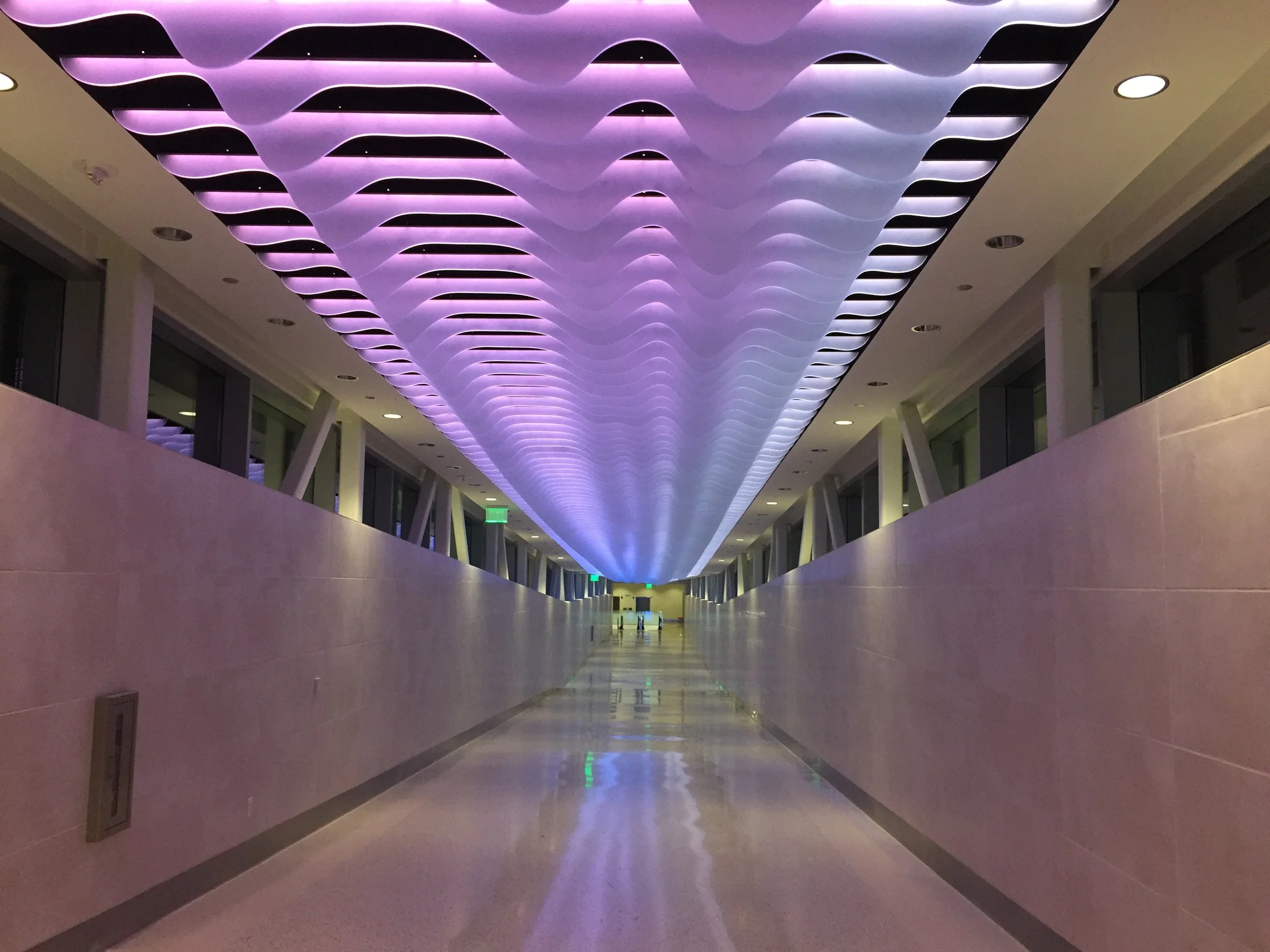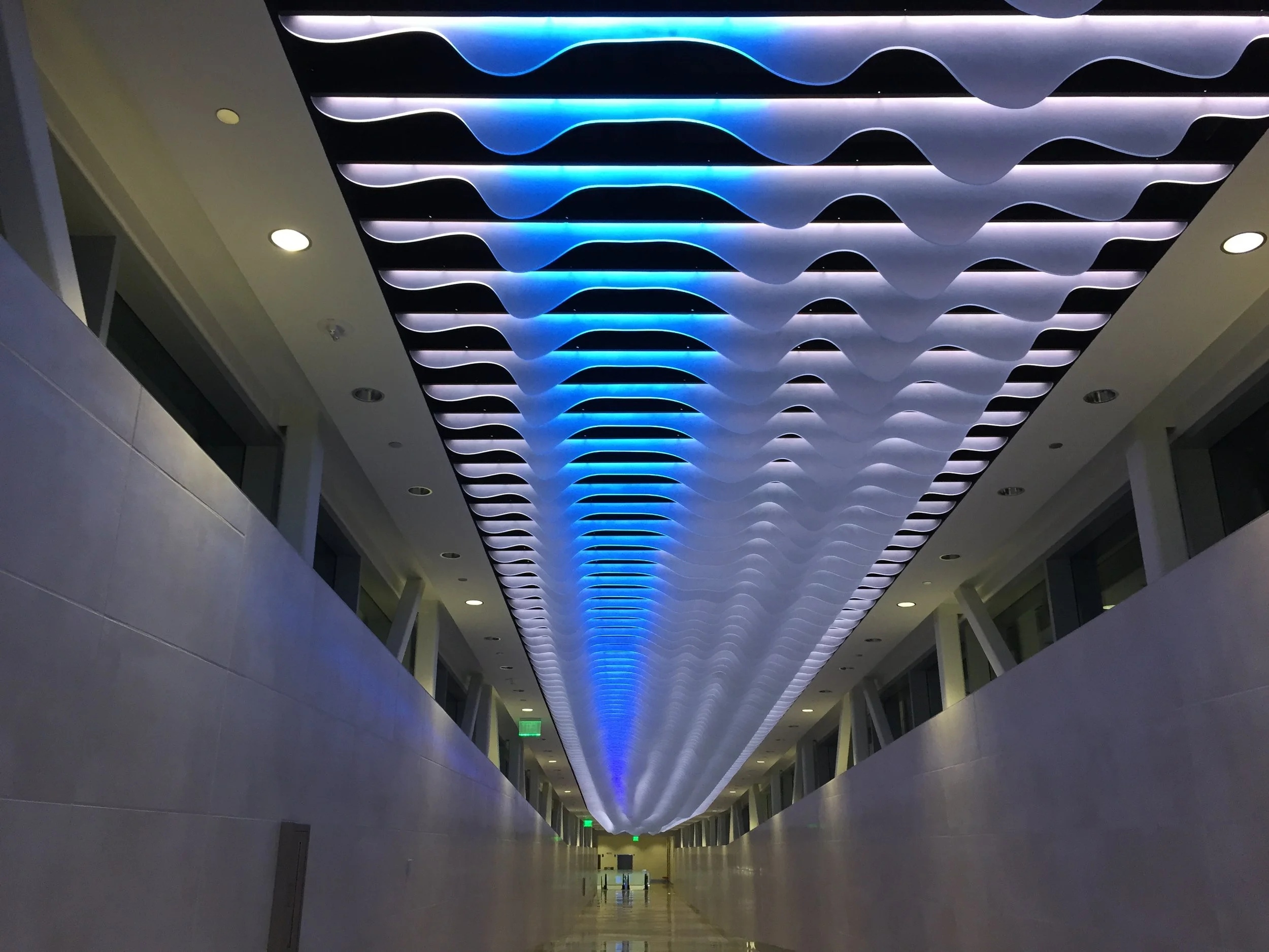 Developed by artists Shane Allbritton and Norman Lee of RE:site, Luminous Stratum is a sculptural installation celebrating flight at the Dallas Love Field Airport. Inspired by contrails in the vibrant sky, the installation is comprised of a series of parametrically generated acrylic fins that subtly change as they move along the length of the installation. These translucent fins are lit by streaks of color that slowly change, blend, and dissipate.
