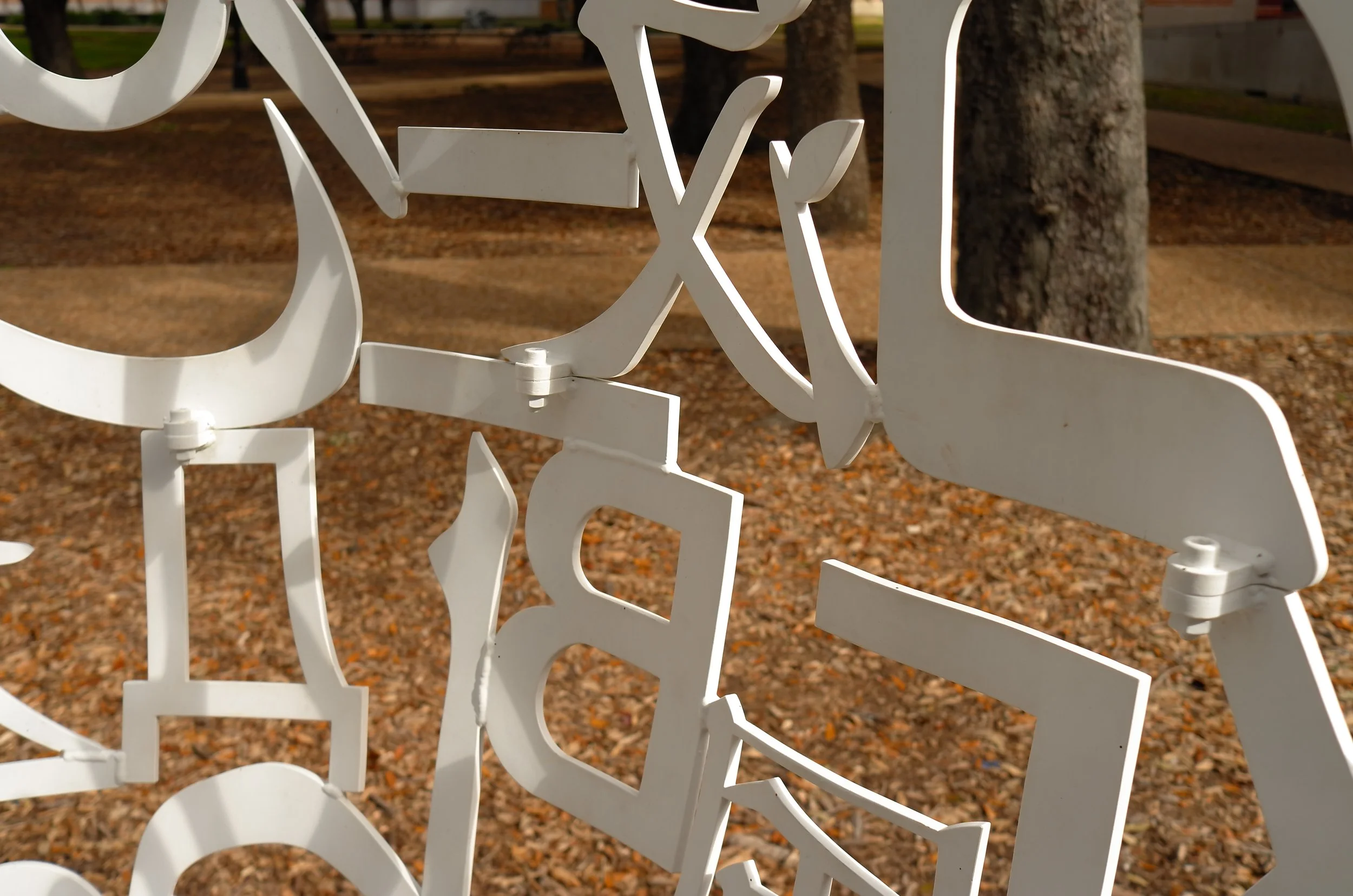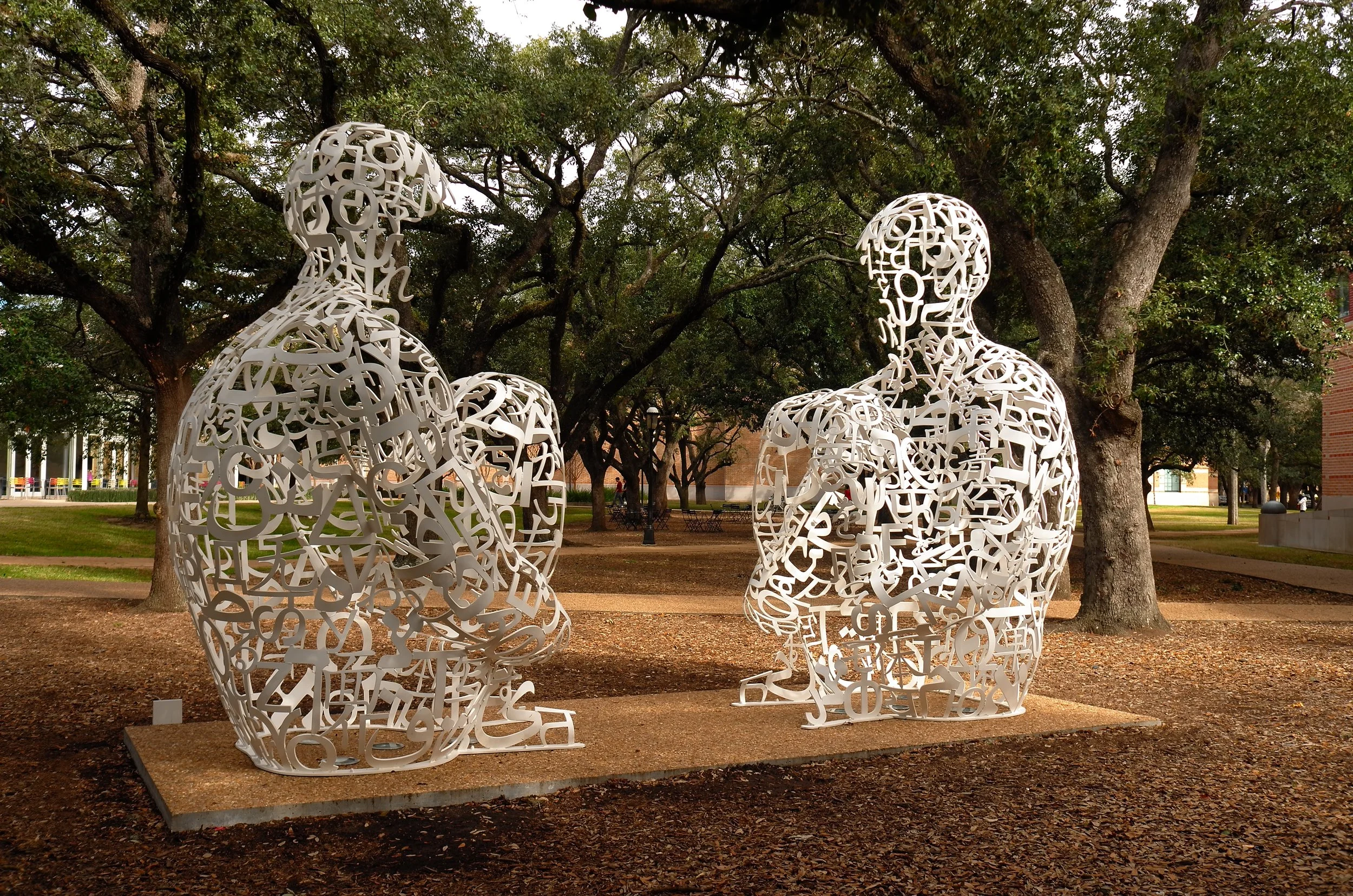 Spanish artist Jaume Plensa’s MIRROR is a pair of two painted steel human figures kneeling opposite each other in the central quad of Rice University. While both figures are taken from the same model, each is composed of a distinct set of characters derived from a mix of ancient languages including Hebrew, Arabic, Chinese, Japanese, Korean, Greek, Latin, Hindi, and Cyrillic. Within their bases are niche for visitors to enter and look back at the twin figure. At night the figures glow from within, creating a beacon on the campus, amoung the oak trees.