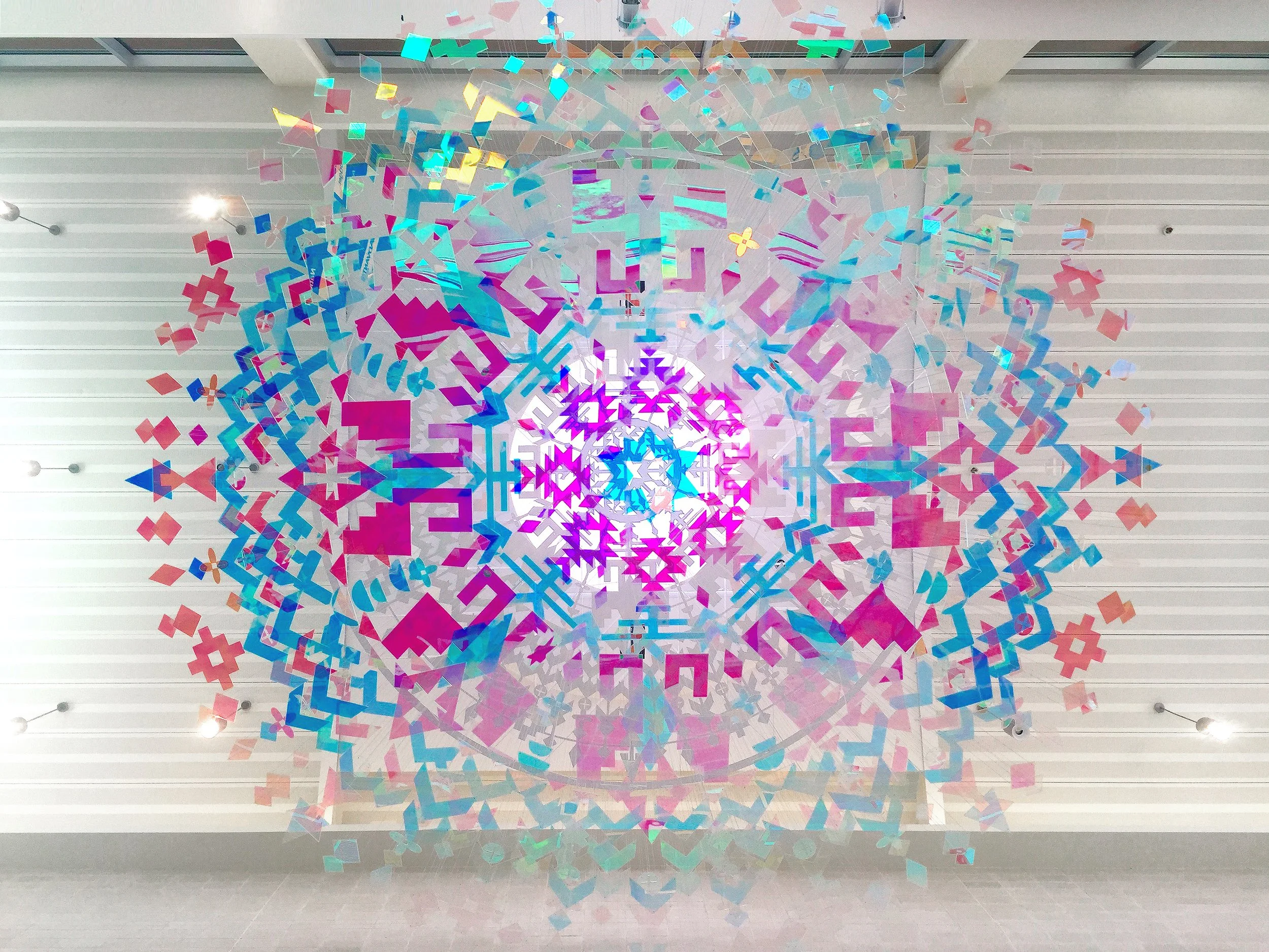 RADIANCE, developed by artists Shane Allbritton and Norman Lee of RE:site, is an artwork designed for the El Paso Airport. The elaborate hanging piece makes use of the iconography of a mix of cultures in El Paso, translating them into a three-dimensional Mandala. Layered acrylic pieces with a dichroic film in the middle form the physical manifestation of the Mandala, which is mirrored in the supporting structure. Suspended from a steel canopy, the colorful and shifting material of the installation plays in the light, evoking the stunning vibrancy of a southwestern sunset.