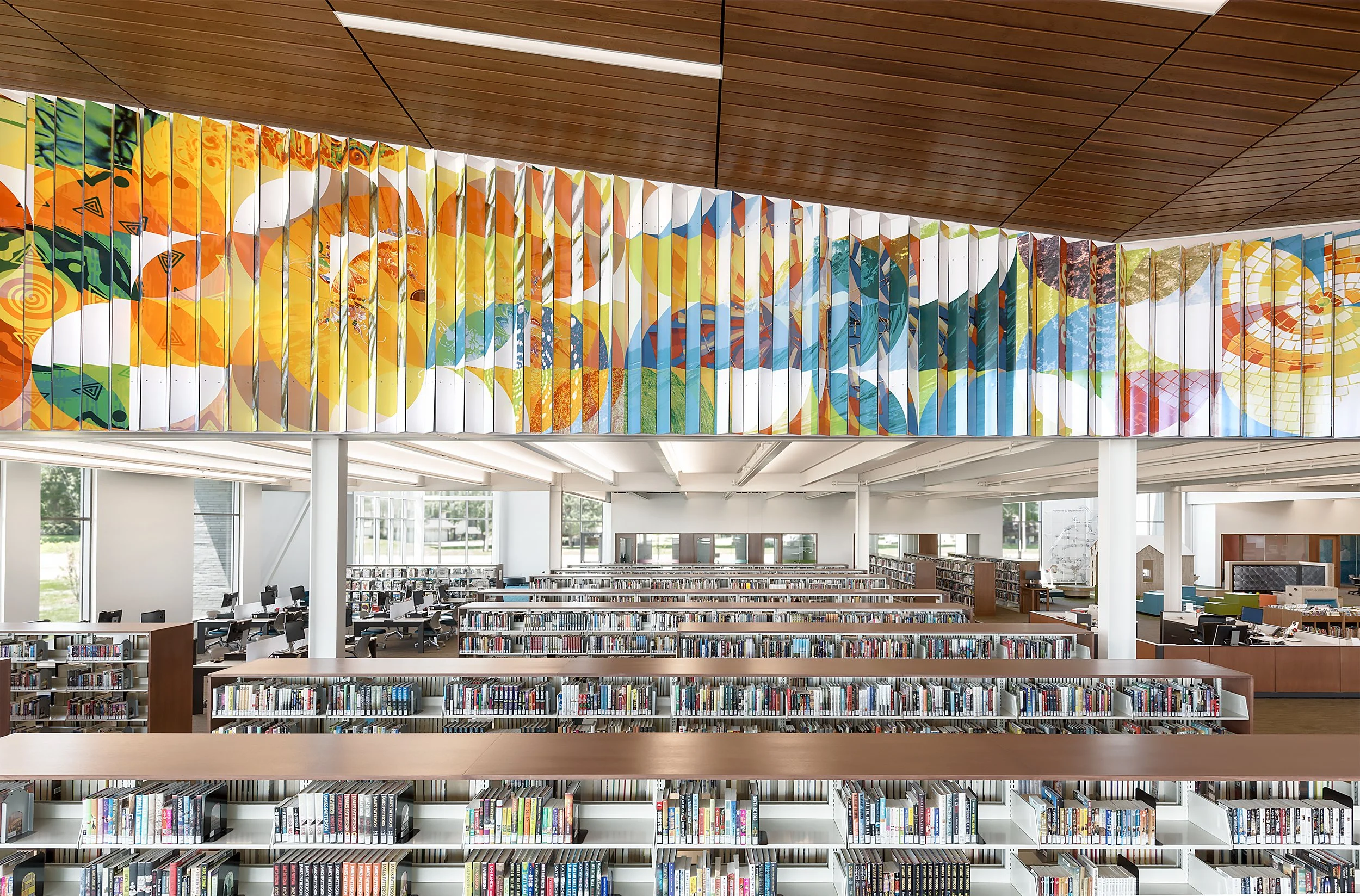 Consisting of 331 art panels total, along 165 feet of elevated wall, the piece closely follows the architectural lines to acheive a tight relationship with the library space. Due to the angled ceiling, 175 panels have unique profiles that would not have been possible without the precision of digital modeling and fabrication. This formal precision, durability, and print quality was made possible through collaboration with Polyvision and their Ceramic Steel printed products.